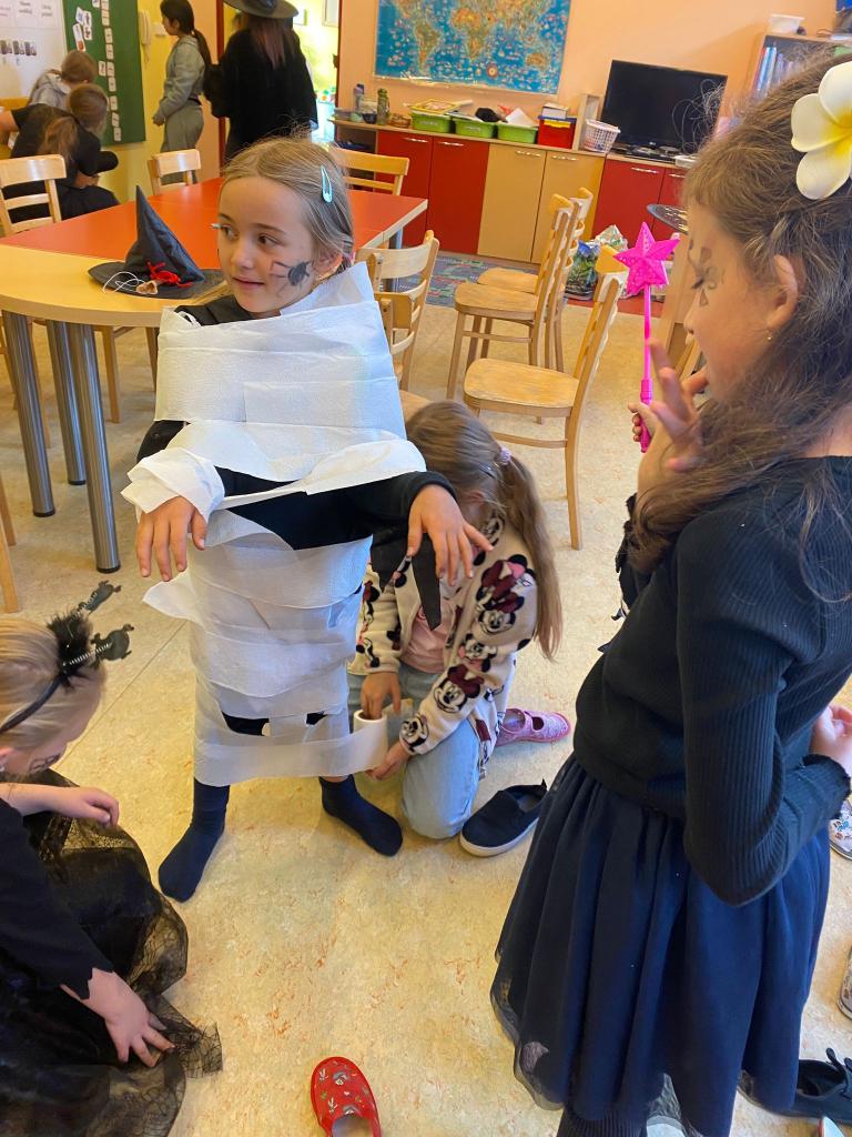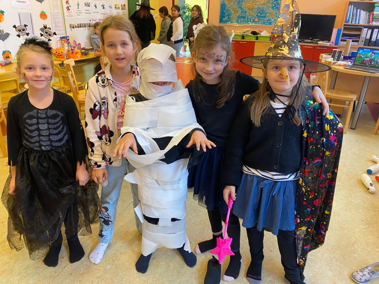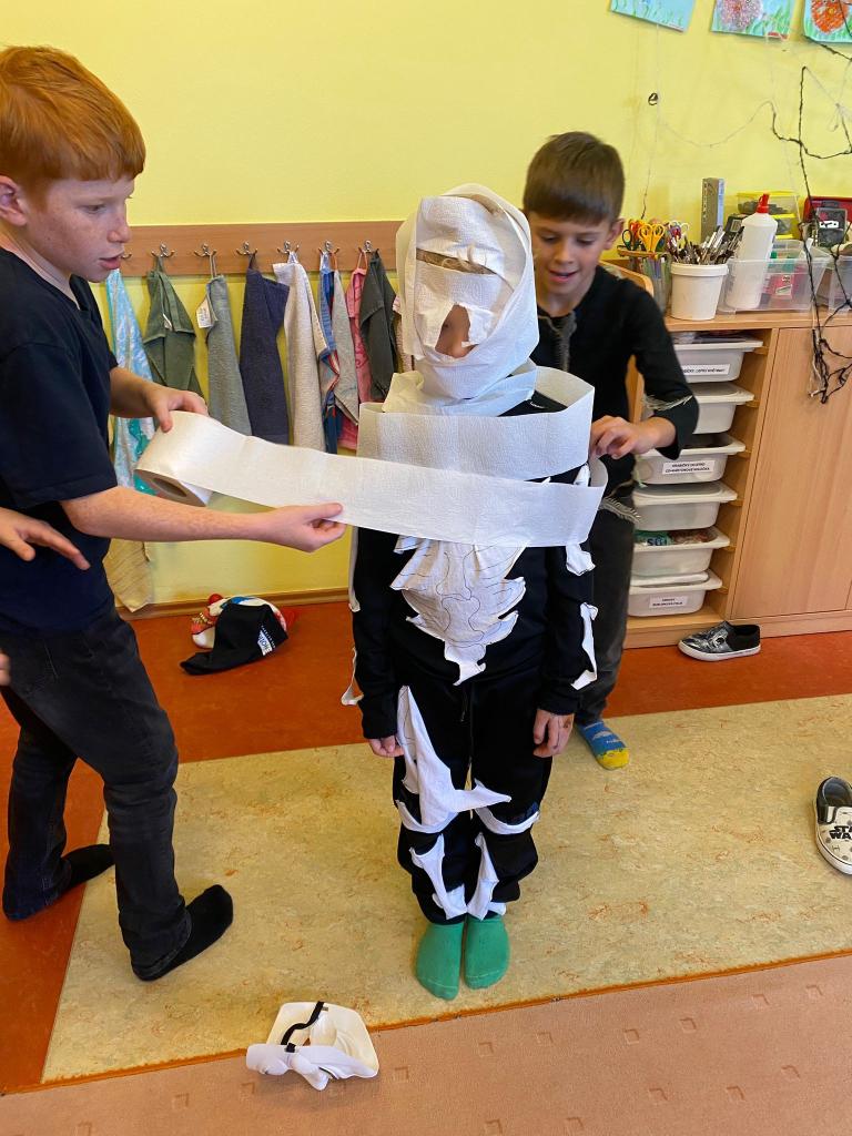 Ve 2. a 4. ročníku děti porovnávaly anglický svátek Halloween s našimi Dušičkami a v hodinách ICT připravovaly tematické plakáty. Rodiče podpořili atmosféru nápaditým rautem plným dobrot. Ve 3.–5. ročníku žáci využili motiv Halloweenu k procvičení programování. Ve školní družině je pak čekalo veselé odpoledne plné masek, her, balení „mumií“, boření duchů, tance a drobných odměn.